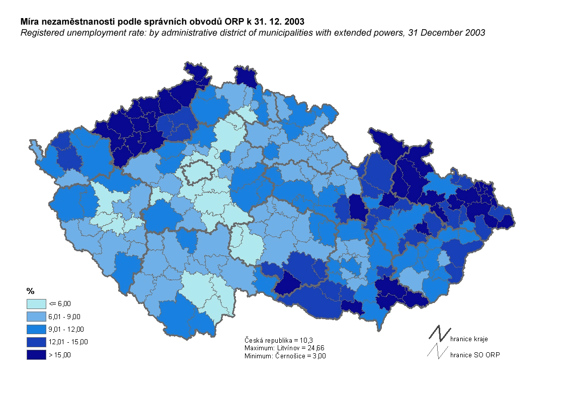 40. Míra registrované nezaměstnanosti podle správních obvodů ORP k 31. 12. 2003