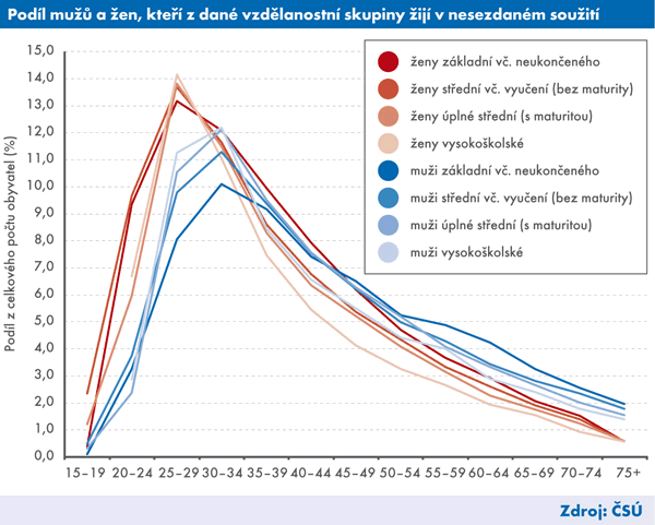 Faktická manželství jsou diferencována také podle nejvyššího dosaženého vzdělání. Celkově nejčastěji v nesezdaném manželství žijí lidé s vysokoškolským vzděláním a to jak muži (6,4 % z celkového počtu vysokoškoláků), tak ženy (7,3 %), naopak nejméně pak lidé se základním vzděláním (okolo 3 % u mužů i u žen). Z grafu je však patrné, že toto pravidlo neplatí univerzálně pro všechny věkové kategorie. Osob žijících v nesezdaných soužitích je mezi vysokoškoláky v porovnání s lidmi se základním vzděláním více pouze ve věku 25–34 let u mužů a 25–29 let u žen, u kterých je tento rozdíl však nepatrný na rozdíl od mužů, u kterých se v těchto věkových kategoriích podíl žijících ve faktickém manželství podle vzdělání liší výrazněji. Ve všech ostatních věkových kategorií je u vysokoškoláků těch, kteří žijí ve faktickém manželství, méně než u osob se základním vzděláním. Tento jev je možné vysvětlit tím, že ve věku okolo 25 let většina vysokoškoláků dokončuje svá studia, což je pro ně často důležitou podmínkou pro uzavření sňatku a založení rodiny. Vzhledem k tomu, že častěji vstupují do manželství, zdá se, že nesezdané soužití je pro ně jen dočasné partnerské uspořádání. Naopak u osob s nižším vzděláním zřejmě nesezdaná soužití mohou představovat určitou alternativu k manželskému svazku a častěji v něm žijí i v pozdějším věku.