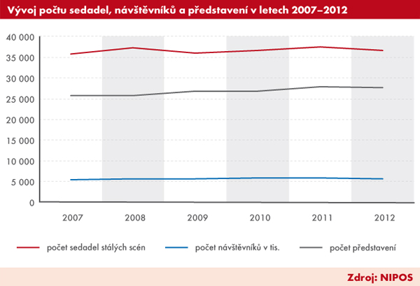 Za posledních šest let také mírně vzrostl počet divadel – ze 133 na 155 (26 % z nich tvořila veřejná divadla, 46 % divadla z neziskové sféry a 28 % komerční divadla). Podnikatelský sektor už obhospodařuje asi jednu čtvrtinu všech diváků (1,5 mil.). Počet nabízených míst se mírně zvyšoval, podobně jako počet návštěvníků, až na hranici 5,5 mil. V období 2007–2012 plynule vzrostl počet premiér na 671 (+15 %) i uváděných titulů na 2 827 (+37 %). Počet představení se pohyboval v intervalu 25–27 tis. Se stálou návštěvností, asi 80 %, stále patříme k evropskému nadstandardu.