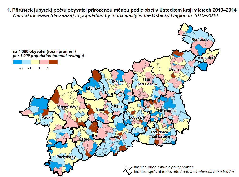 1. Přírůstek (úbytek) počtu obyvatel přirozenou měnou podle obcí v Ústeckém kraji v letech 2010–2014