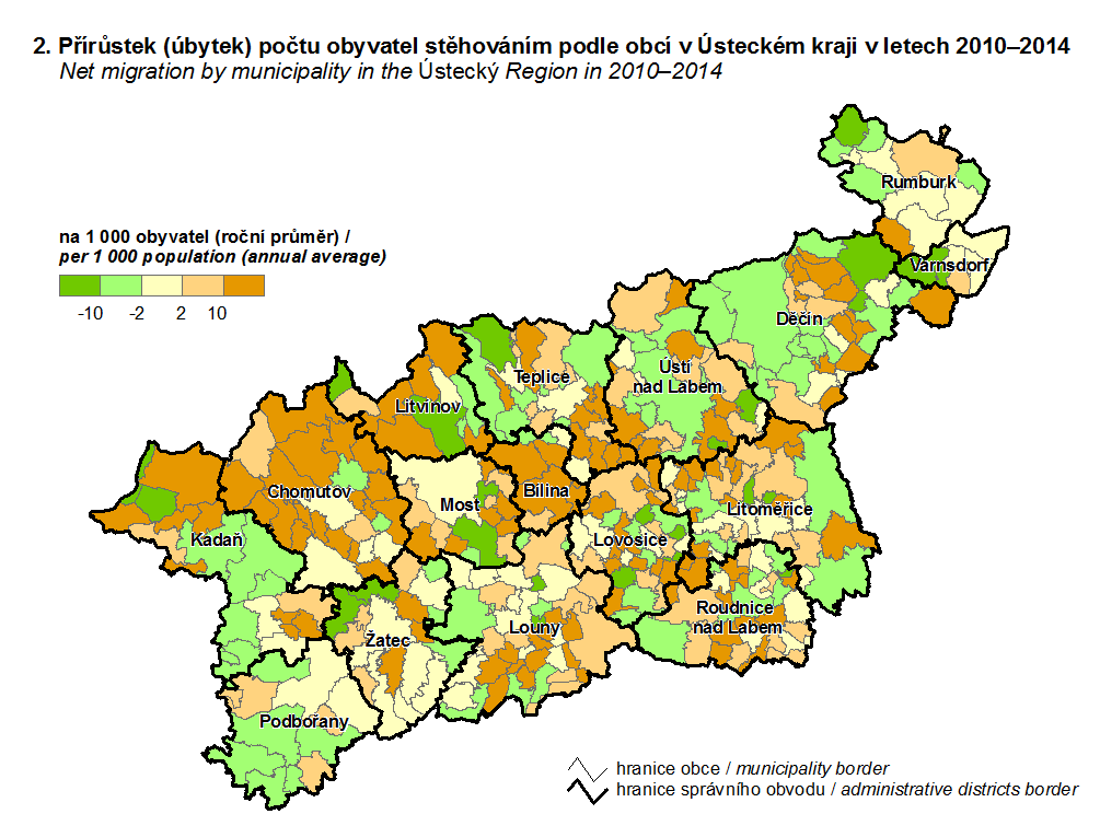 2. Přírůstek (úbytek) počtu obyvatel stěhováním podle obcí v Ústeckém kraji v letech 2010–2014