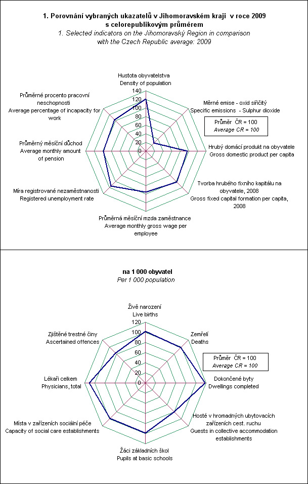 Graph 1 Selected indicators on the Jihomoravský Region in comparison with the Czech Republic average: 2009