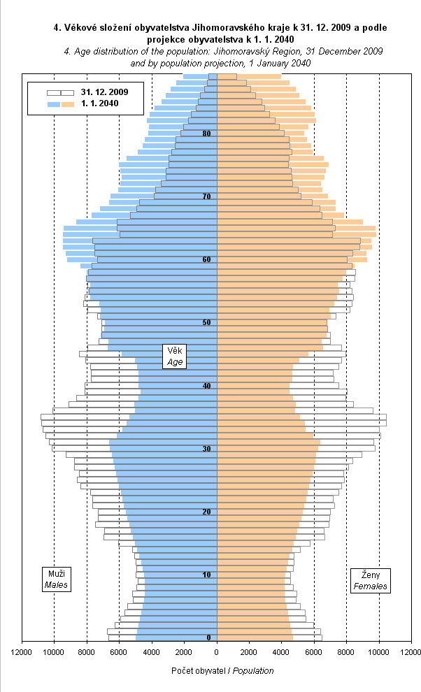 Graph 4 Age distribution of the population: Jihomoravský Region, 31 December and by population projection, 1 January 2040