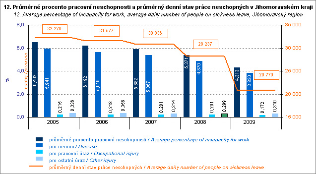Graph 12 Average percentage of incapacity for work, average daily number of people on sickness leave, Jihomoravský Ragion