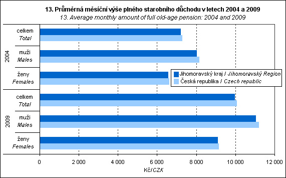 Graph 13 Average monthly amount of full old-age pension: 2004 and 2009