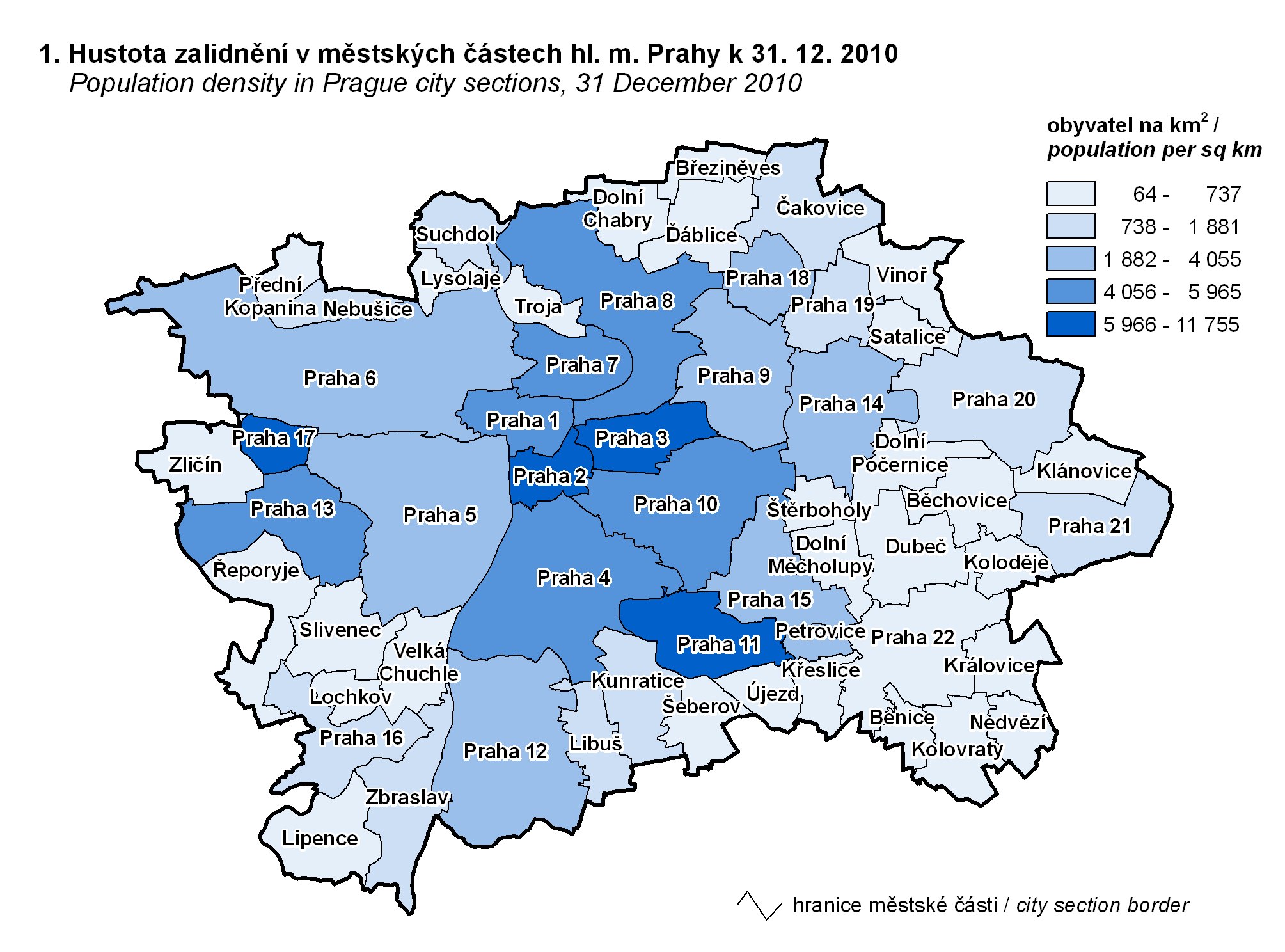 1. Population density in Prague city section, 31 December 2010