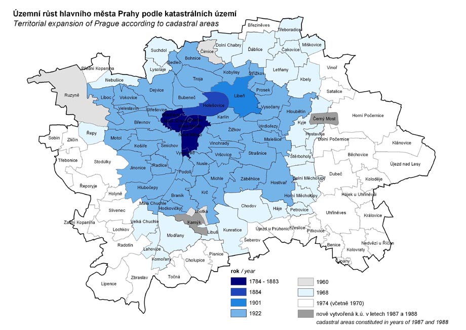 Territorial expansion of Prague according to cadastral areas