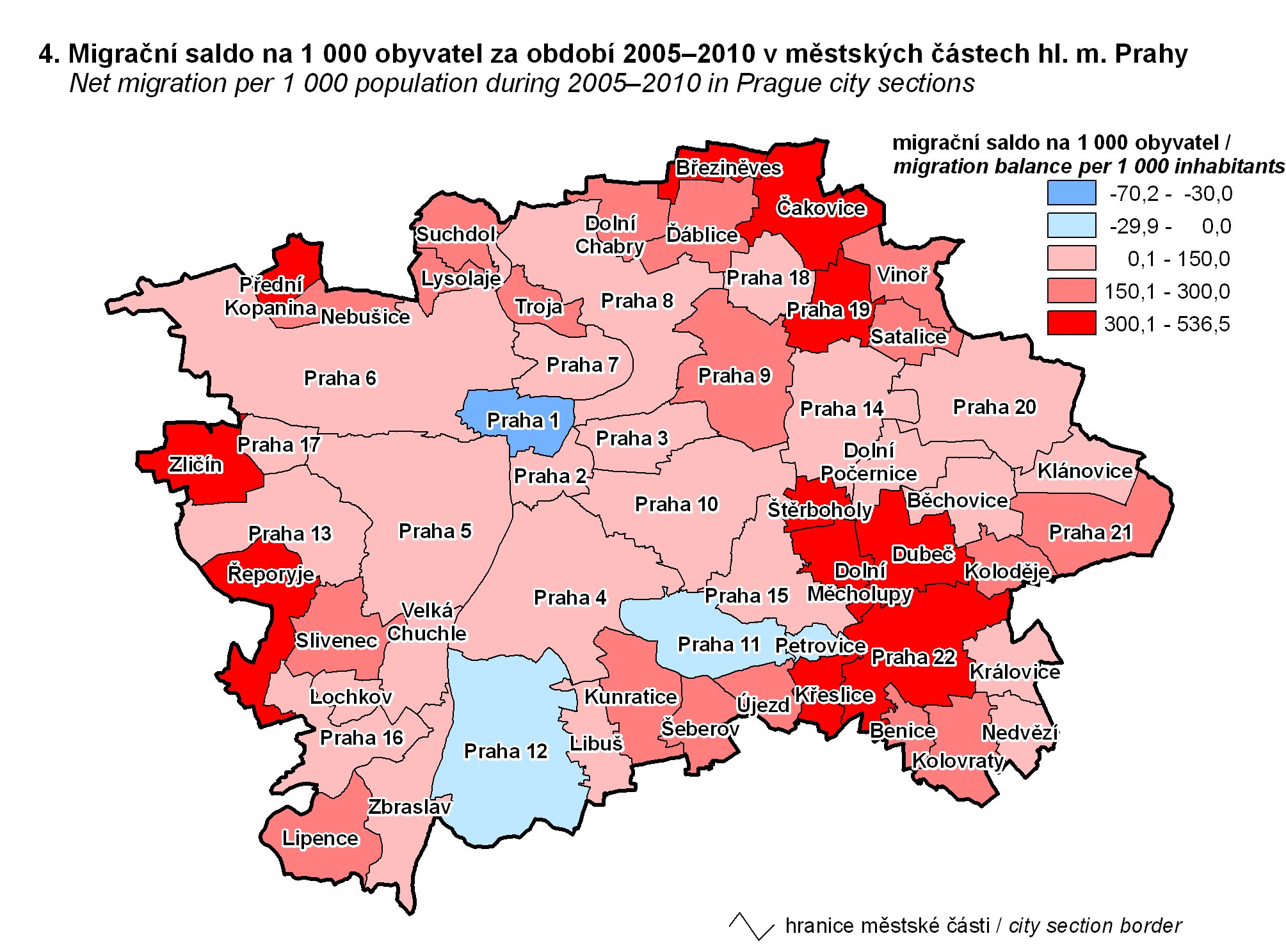 4. Net migration per 1 000 population during 2005–2010 in Prague city sections