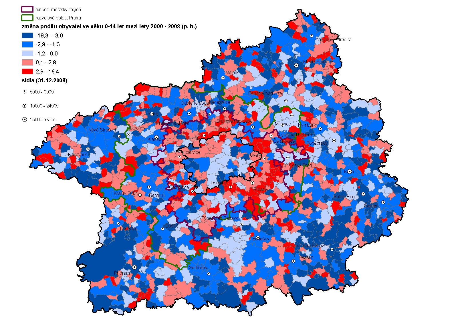 Z celkového počtu obcí patřících do funkčního regionu došlo mezi lety 2000 a 2008 k největšímu poklesu zastoupení dětí (více než 4 procentní body) v 11 obcích. Většinou jsou prostorově odděleny až na 3 obce, které jsou vzájemně lokalizovány poměrně blízko (oblast mezi Prahou a Kladnem - Zájezd, Číčovice, Kněževes). Právě na příkladu obce Kněževes je vidět, že stěhování do okolí Prahy je proces selektivní. Ačkoliv je obec v rámci funkčního regionu lokalizována velmi blízko Praze a dalo by se tedy očekávat, že bude dosahovat hodnot ukazatelů minimálně na úrovni průměru funkčního regionu, dochází zde k opačnému vývoji. Došlo tu k nadprůměrnému poklesu počtu obyvatel (o 4 p. b. vůči roku 2000) a také k poklesu zastoupení dětí (o 6,8 p.b.). Navíc migrační saldo za období 2000 až 2008 je zde záporné a počet dokončených bytů zde byl vzhledem k hodnotě funkčního regionu podprůměrný.