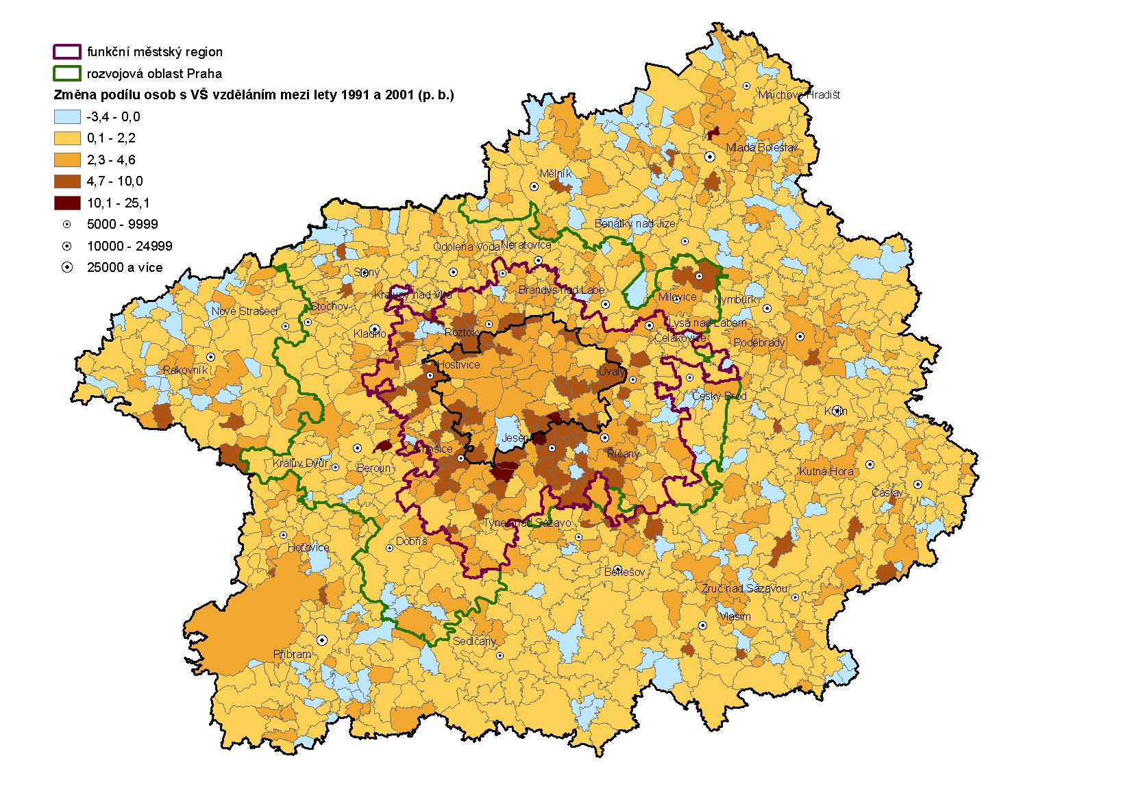 Je zřejmé, že oblast pražské periferie a území funkčního regionu mimo Prahu jsou kompaktní oblastí s podobným vývojem a představují skutečně zázemí Prahy. Jde o souvislou oblast, kde mezi lety 1991 a 2001 došlo k největšímu zvýšení podílu vysokoškolsky vzdělaných obyvatel. Oblast s vysokým vzrůstem podílu vysokoškoláků končí za hranicemi funkčního regionu. Rozvojová oblast zdaleka neukazuje tak výrazný posun.