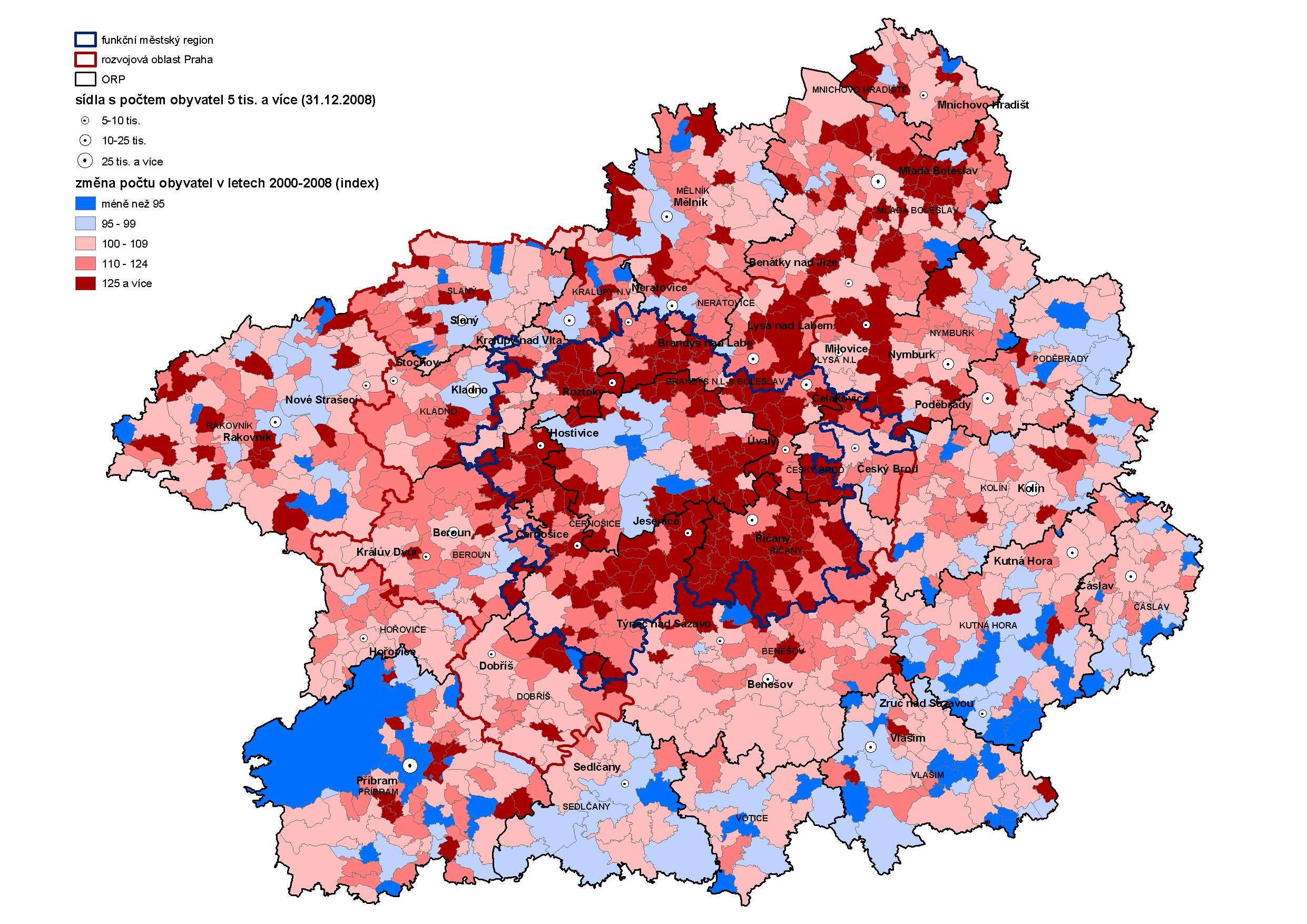 Mezi obce, které měly v letech 2000 až 2008 více než dvounásobný růst počtu obyvatel (celkem 17), patří i 3 městské části Prahy – Praha-Křeslice, Praha-Běchovice a Praha-Štěrboholy. Jde o městské části okrajových oblastí Prahy, z toho pouze Štěrboholy byly k Praze připojeny již v roce 1968, ostatní dvě městské části až při posledním rozšiřování Prahy v roce 1974. Obce ve Středočeském kraji s největším růstem počtu obyvatel jsou logicky především v okresech Praha-východ a Praha-západ. Ve východním okolí Prahy jde o obce, které jsou si i prostorově blízké (Květnice, Nupaky, Babice). Mezi obce, které měly ve sledovaném období více než dvojnásobný nárůst počtu obyvatel se však dostaly také dvě, které nepatří ani do funkčního regionu ani do rozvojové oblasti – obce Rabakov a Bradlec, obě patří do správního obvodu města Mladá Boleslav. Obec Bradlec 2) leží v těsném sousedství Mladé Boleslavi, která je hlavním centrem pracovních příležitostí (Škoda Auto) i občanské vybavenosti. Je zde kladné migrační saldo, nejvíce obyvatel se stěhuje do Mladé Boleslavi a pak do Prahy, stejně je tomu u vystěhovalých. I v tomto případě lze dokumentovat provázanost zázemí (Bradlec) a jádra (Mladá Boleslav).