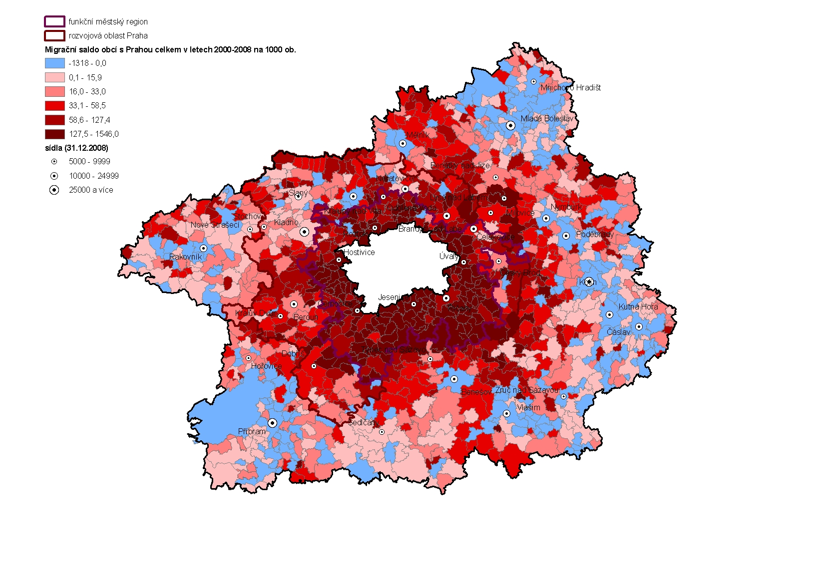 Při hodnocení migrace obcí s Prahou vyplývá z mapy několik skutečností. Za prvé je velmi zřetelně ohraničeno území funkčního regionu, kde je ve valné většině obcí dosahováno nejvyšších hodnot migračního přírůstku s Prahou. Znamená to, že obyvatelé Prahy se do obcí výrazně více přistěhovávají než obyvatelé obcí do Prahy. Také v rozvojové oblasti se více stěhují obyvatelé z Prahy do obcí než naopak. Ovšem i v celém Středočeském kraji převládá příliv obyvatel z Prahy, pouze některé poměrně jasně vyhraněné oblasti jsou migrací s Prahou ztrátové: Mladobolelavsko, Příbramsko, Vlašimsko a Kutnohorsko. Z těchto oblastí se tedy obyvatelé více do Prahy vystěhovávají než naopak. V Mladé Boleslavi k tomu přistupuje další faktor, který z kartogramu nevyplývá: město je samo o sobě velmi silné a v jeho regionu spíše převládá migrace do a z Mladé Boleslavi. Méně se tu obyvatelstvo stěhuje do ostatních oblastí včetně Prahy.