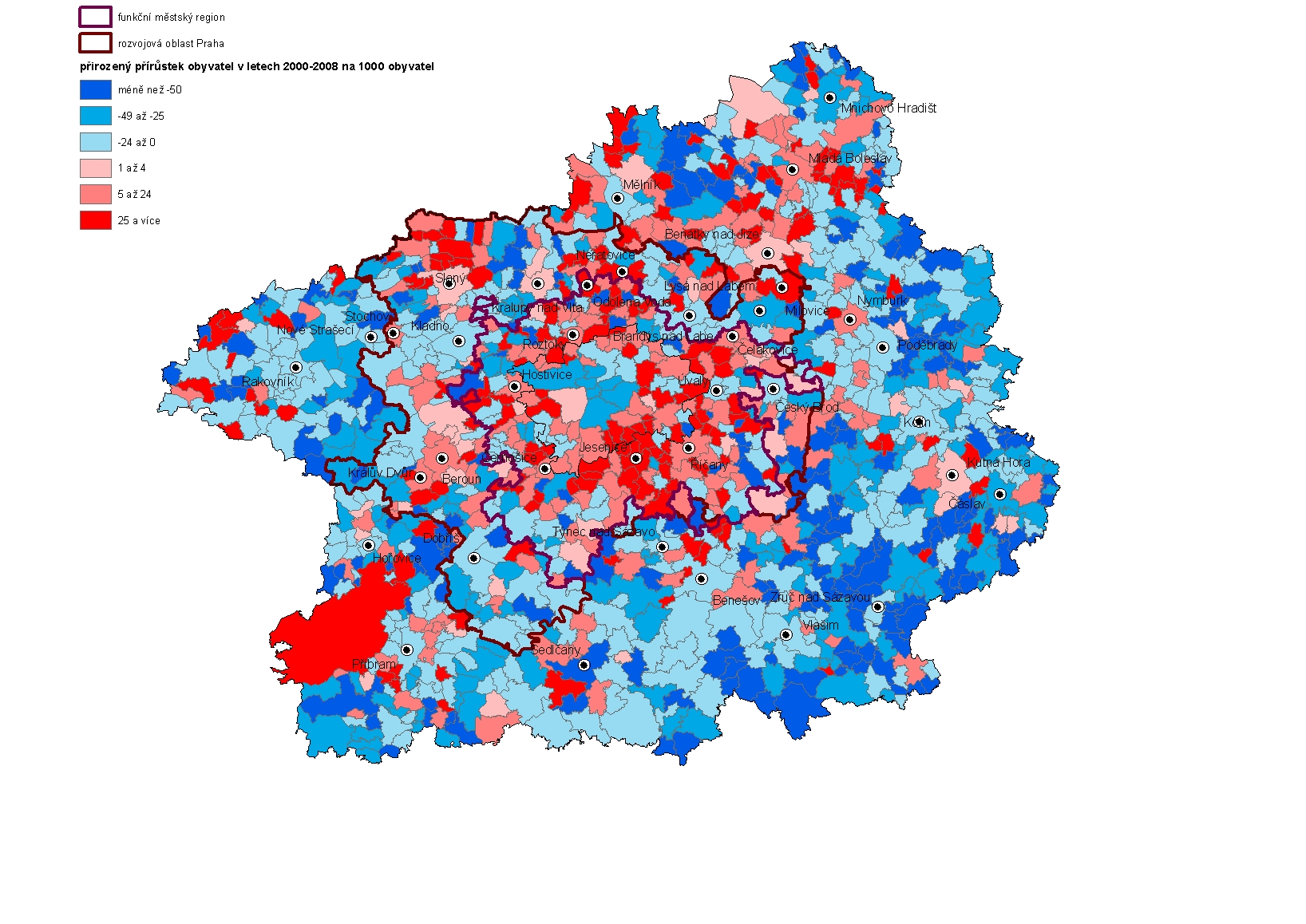 Přirozený přírůstek byl ve sledovaném období nejvyšší opět v funkčním regionu, a méně v rozvojové oblasti. I když v rozvojové oblasti se vyskytlo méně obcí s přirozeným přírůstkem než ve funkčním regionu, přesto se dá i tato oblast označit za oblast s pozitivním demografickým vývojem. Za hranicemi rozvojové oblasti již převládá území přirozeného úbytku. Stejně jako v případě nárůstu celkového počtu obyvatel i pro přirozený přírůstek platí, že kladných hodnot je mimo naše dvě zájmová území dosahováno také v oblasti směrem na Mladou Boleslav a nově i směrem na Slaný. Kompaktní oblasti s nejvyššími úbytky se vyskytují na jihovýchodě Středočeského kraje.