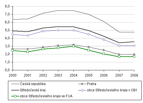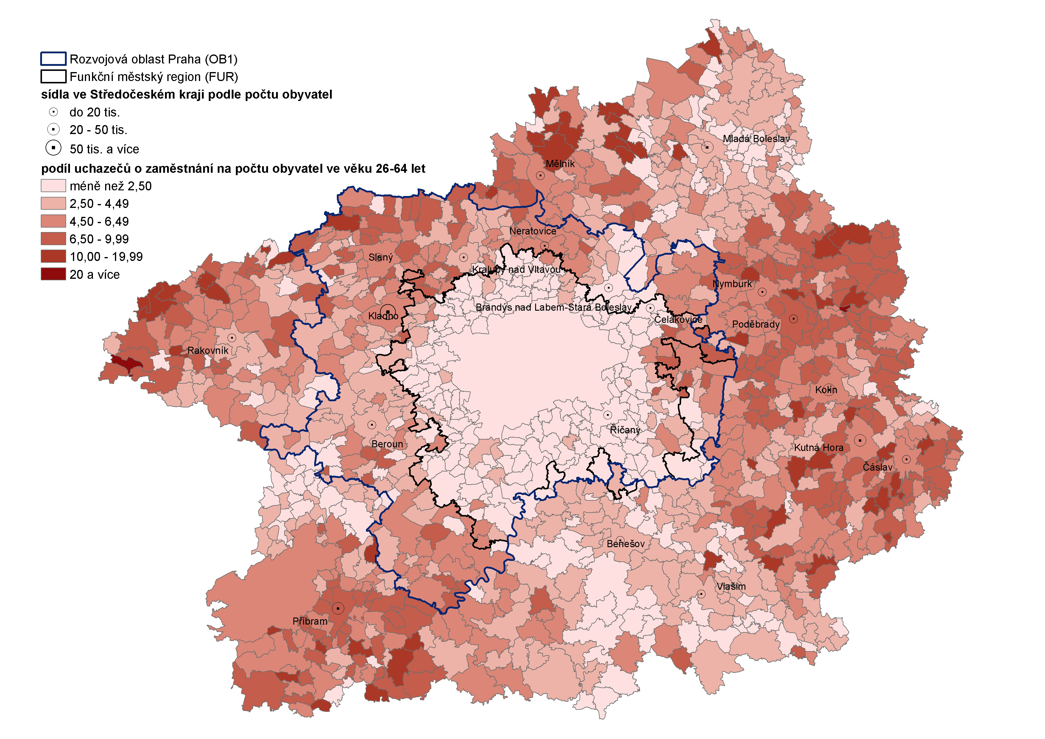 Uchazeči o zaměstnání jsou evidovaní podle místa trvalého bydliště. Vývoj počtu uchazečů o zaměstnání podle evidence úřadů práce se vyvíjel ve všech zájmových územích shodným způsobem. Od roku 2001 jejich počet rostl do roku 2004 kdy jejich počty dosáhly vrcholu v průběhu sledovaného období. Výjimku tvořil vývoj za ČR celkem a obce Středočeského kraje, které nebyly zahrnuty do zázemí hlavního města (Rozvojová oblast, Funkční městský region), u těchto území byl nejvyšší počet uchazečů evidován v roce 2003. Od roku 2004 (respektive 2003) počet uchazečů každoročně klesal až do roku 2007. Mezi lety 2007 a 2008 došlo ke stagnaci uchazečů o zaměstnání evidovaných úřady práce na území republiky. V Praze a Středočeském kraji došlo k mírnému zvýšení jejich počtů.