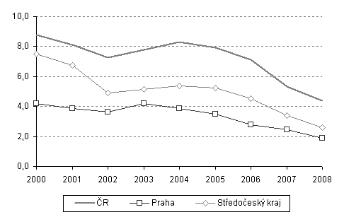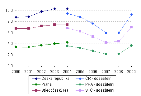 Vzhledem k roku 2000 byla míra nezaměstnanosti vyšší obecně i všechny specifické. Během posledních devíti let se celková míra nezaměstnanosti ve Středočeském kraji více přiblížila hodnotě v hlavním městě.