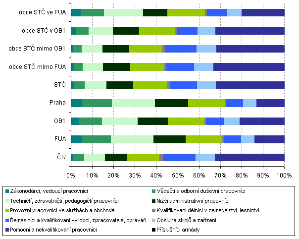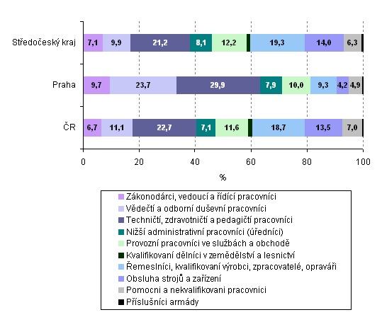 Rovněž v členění zaměstnaných osob podle klasifikace zaměstnání platí, že se struktura pracovníků v Praze odlišuje od celorepublikového složení, struktura pracovníků ve Středočeském kraji je podobná složení ČR.