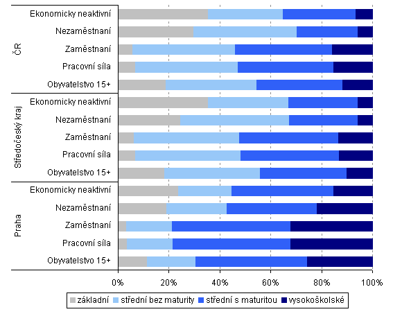 Takové rozdíly ve vzdělanostní struktuře osob podle ekonomické aktivity jsou stejné jak na území Prahy, tak na území Středočeského kraje nebo ČR, existují rozdíly v zastoupení jednotlivých skupin podle vzdělání v populaci a přeneseně i v jednotlivých skupinách podle stupně ekonomické aktivity.