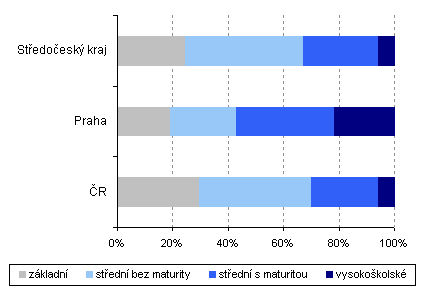 V České republice jako celku je míra nezaměstnanosti vyšší, to platí i pro jednotlivé skupiny podle dosaženého vzdělání. Zejména markantní je rozdíl v míře nezaměstnanosti u osob se základním vzděláním, které v republice ve větší míře nemohou nalézt pracovní uplatnění. Míra nezaměstnanosti u této skupiny je největší i v Praze a Středočeském kraji. Můžeme spekulovat o tom, nakolik cizinci většinou zaměstnaní na pracovních pozicích s malými požadavky na kvalifikace zabírají místo ostatním uchazečům o práci. Zde je však třeba dodat, že cizinci představují levnou pracovní sílu, která může konkurovat dražší a také méně vzdělané pracovní síle ostatních uchazečů.
