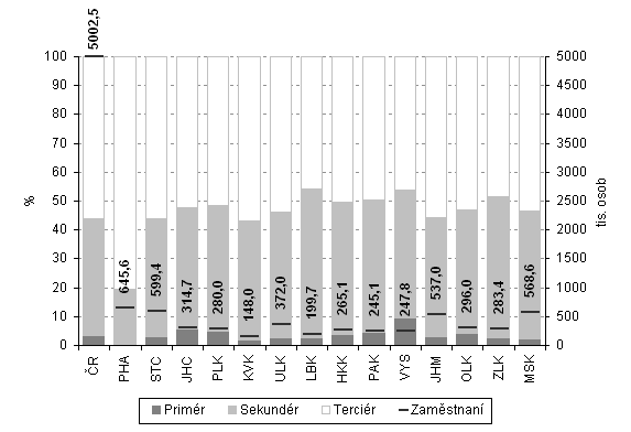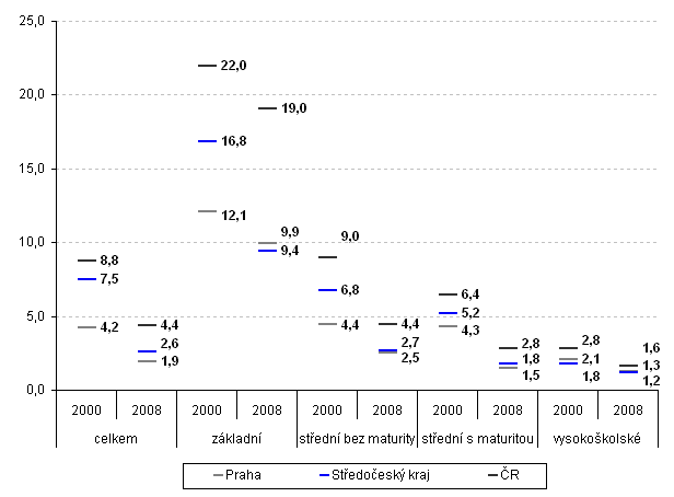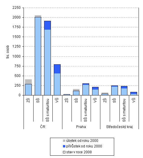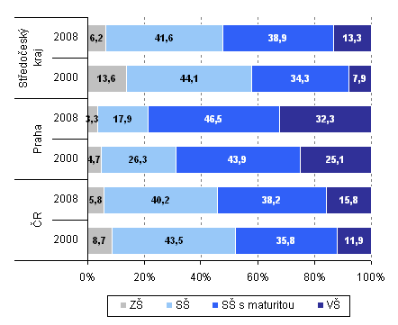 Od roku 2000 do roku 2008 v celé ČR ubylo mezi zaměstnanými osobami lidí se základním a středním vzděláním bez maturity, na druhé straně se významně zvýšil počet zaměstnaných s úplným středoškolským vzděláním a vysokoškolsky vzdělaných zaměstnaných osob. Podobný vývoj proběhl i v Praze. Již před devíti lety byla vzdělanostní struktura obyvatel Prahy nadprůměrná, změny proto nejsou tak dramatické. Ve Středočeském kraji došlo k poklesu zaměstnaných osob se základním vzděláním, zvýšil se počet v ostatních skupinách zaměstnaných osob podle úrovně dosaženého vzdělání. Oproti vývoji v ČR celkem se zvýšil počet zaměstnaných ve skupině odborného středoškolského vzdělání bez maturity.