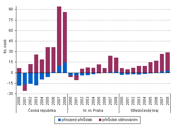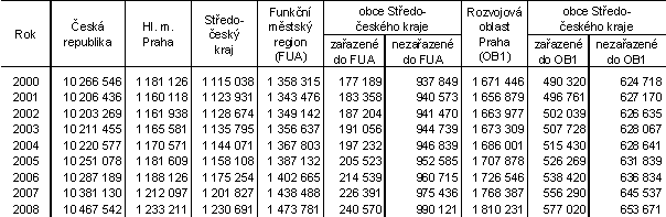 Vývoj počtu obyvatel v posledních devíti letech je dynamičtější než v předcházejících dvaceti. Po počátečním poklesu počtu obyvatel ČR na začátku 21. století docházelo k pravidelným meziročním nárůstům, počet obyvatel v roce 2008 byl o 2 % vyšší než v roce 2000. Stejným vývojem prošel počet obyvatel hlavního města. Naproti tomu počet obyvatel Středočeského kraje rostl setrvale v celém devítiletém časovém období, postupně i rychleji. Vývoj počtu obyvatel byl v tomto období již byl významně ovlivněn zahraniční migrací. Cizinci jsou v celkovém počtu obyvatel zahrnováni od roku 2001.