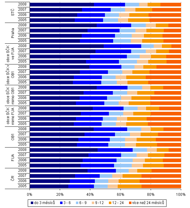 Údaje o uchazečích o zaměstnání poskytují i informace o délce, po kterou jsou nezaměstnaní vedeni v evidenci úřadů práce. Takto podrobné informace nejsou k dispozici pro celé období 2000-2008. V libovolném zájmovém území pozorujeme zvyšování podílu uchazečů evidovaných na úřadech práce méně než 3 měsíce. Na druhé straně mezi uchazeči o zaměstnání klesá zastoupení osob nezaměstnaných déle než 1 rok.