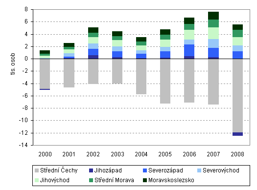 I souhrnný přehled za roky 2000-2008 vykazuje stejné pořadí krajů podle počtu přistěhovalých a vystěhovalých do a z Prahy. Nejmenší je výměna obyvatel mezi Prahou a ostatními kraji v případě krajů Olomouckého a Zlínského.
