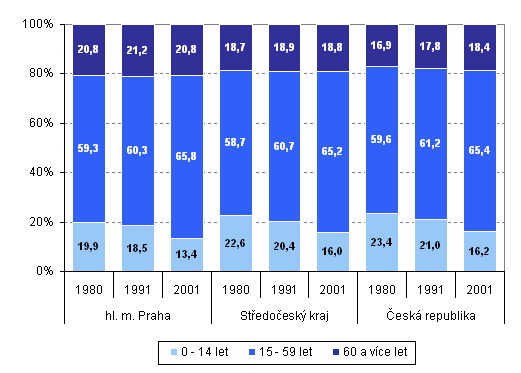 V roce 1980 připadalo v Praze 69 dětí ve věku 0-14 let a osob ve věku 60 a více let na 100 obyvatel ve věku 15-59 let. K datu sčítání v roce 2001 byl tento poměr pouze 52. V Praze dochází k významnému zvyšování zastoupení osob v produktivním věku vzhledem k zastoupení dětí a starších občanů. Obdobný je vývoj i ve Středočeském kraji a České republice, kde však na 100 obyvatel v produktivním věku připadá více dětí a starších osob. Takový vývoj může být dočasně ekonomicky příznivý, dlouhodobě však dochází k nadměrnému zastoupení osob starších ročníků a poklesu zejména mladé pracovní síly.
