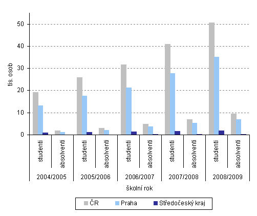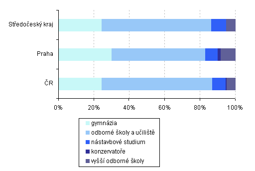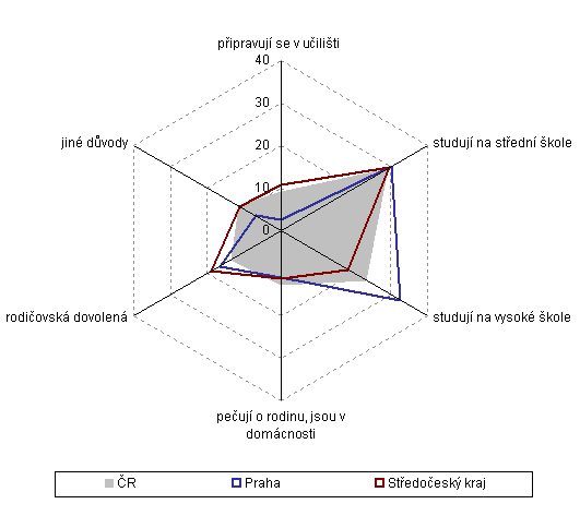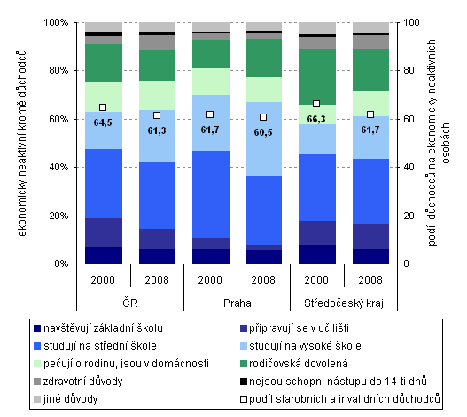 Další významnou skupinou neaktivních osob jsou žáci a studenti. Rovněž podíl této skupiny je v Praze zvýšený, zároveň se liší jejich složení podle navštěvované školy. V Praze je vyšší zastoupení zejména studentů vysokých škol. Ve Středočeském kraji je mezi studenty větší zastoupení těch, kteří se připravují na učilištích a středních školách. V Praze i ve Středočeském kraji je menší zastoupení osob v domácnosti než je jejich podíl v celé ČR, větší je naopak zastoupení osob na rodičovské dovolené v hlavním městě i v sousedním kraji.