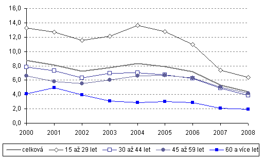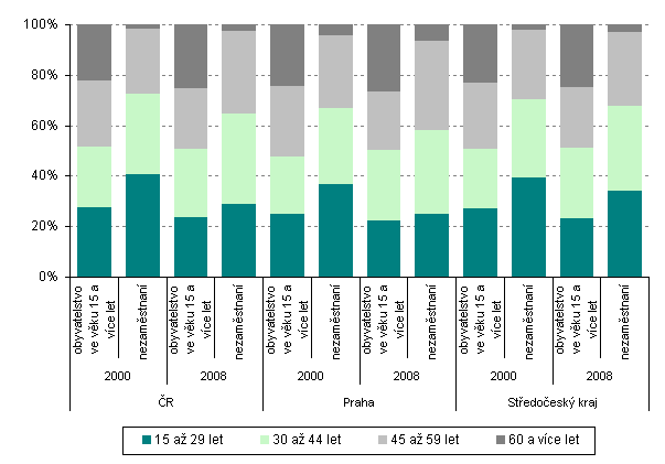 Oproti věkové struktuře obyvatelstva celkem (pro potřeby sledování trhu práce jsou bráni v úvahu pouze obyvatelé ve věku 15 a více let) je mezi nezaměstnanými větší zastoupení osob ve věku 15-29 let, tedy "nováčci" na trhu práce. Ve srovnání se situací v roce 2000 je však jejich zastoupení v roce 2008 významně nižší a to zejména v Praze a v ČR celkem. Podobně je tomu i u další věkové skupiny, 30-44 let, kde jsou lidé na vrcholu kariéry, jejich určitý pohyb na trhu práce je očekávaný. Zastoupení nezaměstnaných ve věku 45-59 let je rovněž větší než je zastoupení těchto osob v celém obyvatelstvu. Tato věková skupina byla i v rámci politiky zaměstnanosti identifikována jako riziková, zaměstnatelnost těchto osob je omezená. Osoby starší 59 let jsou z velké části již ekonomicky neaktivní, jejich zastoupení mezi nezaměstnanými je minimální.