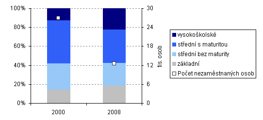 Ve struktuře nezaměstnaných osob je zvýšené zastoupení osob se základním a středním vzděláním bez maturity než je jejich zastoupení v celé populaci obyvatel 15letých a starších (u kterých má sledování ekonomické aktivity a dosaženého vzdělání smysl). Naopak osoby s vyšším ukončeným vzděláním se mezi nezaměstnanými osobami nacházejí v menší míře než je tomu celkem v populaci.