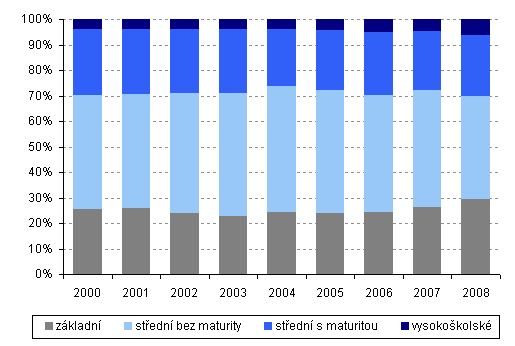 Rozdíly mezi skupinami v uplatnění na trhu práce existují i podle rozdělení podle úrovně dosaženého vzdělání. Struktura nezaměstnaných osob podle vzdělání se v průběhu období 2000-2008 měnilo v České republice jen velmi málo.