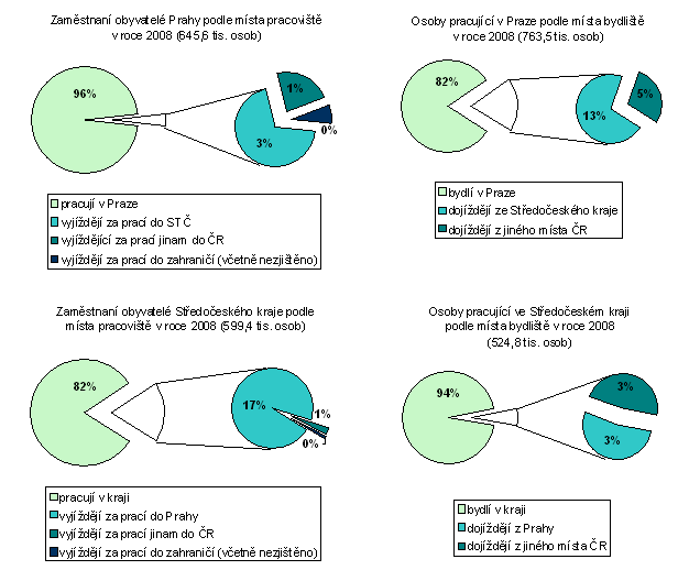 Ve Středočeském kraji je větší část zde pracujících osob tvořena samotnými obyvateli kraje (94 %). Zbylých cca 30 tis. osob dojíždějících do Středočeského kraje za prací je rovnoměrně rozděleno mezi obyvatele Prahy a souhrnem obyvatel ostatních krajů ČR.