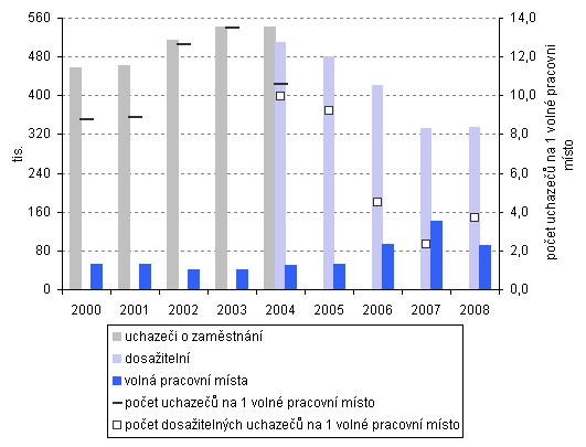 Uchazeči o zaměstnání představují na trhu práce stranu nabídky. Poptávku po práci je možné popsat prostřednictvím volných pracovních míst. Ke konci roku 2008 bylo v celé ČR v evidenci úřadů práce 352 tis. osob, volných pracovních míst bylo 91 tisíc.