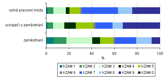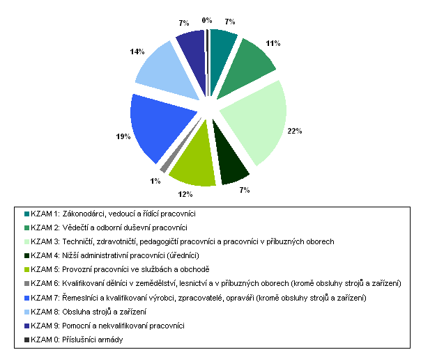 Strukturu uchazečů o zaměstnání lze sledovat i podle klasifikace zaměstnání (KZAM). Podle této klasifikace lze rozdělit uchazeče do 10 tříd, podle kterých je možné sledovat i volná pracovní místa a na základě srovnání těchto skupin je možné usuzovat na nesoulady na trhu práce. Takové srovnání má ovšem svoje hranice, neboť zejména uchazeči mohou být flexibilní natolik, aby mohli působit na pracovním místě v jiné třídě podle klasifikace zaměstnání. Základní třídy podle klasifikace zaměstnání se vyznačují nerovnoměrností zejména co se týče určitosti vymezení. Následující graf ukazuje složení zaměstnaných osob v ČR v roce 2008 podle této klasifikace.