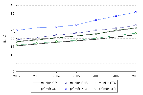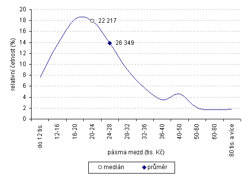 Proto se poslední dobou ukazatel průměru doplňuje o informaci, jaký je medián hrubé měsíční mzdy. Tato hodnota udává prostý fakt, že polovina pracujících v ČR pobírá mzdu menší než je hodnota mediánu, polovina pracujících má větší měsíční mzdu. Z grafu je dále patrné, že větší část obyvatel pobírá hrubou mzdu menší, než je průměrná hodnota, jedná se cca o 2/3 zaměstnanců.