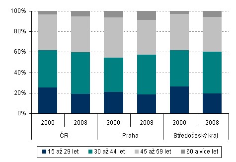 V období 2000-2008 došlo k proměně věkové struktury zaměstnaných osob. V roce 2008 bylo věkové složení zaměstnaných osob v ČR, Praze i Středočeském kraji velmi podobné. V uplynulých devíti letech se významně zvýšilo zastoupení zaměstnaných osob ve věku 30-44 let, a 60letých a starších, což vedlo ke snížení podílu věkových skupin 15-29letých a 45-59letých na celkovém počtu zaměstnaných osob. Je pravděpodobné, že na změnu věkové struktury působí vyšší počtu studentů vysokých škol, zvýšená ochota stěhovat se za prací zkušených pracovníků postupujících v pracovní kariéře a oddalování odchodu do důchodu starších zaměstnanců.