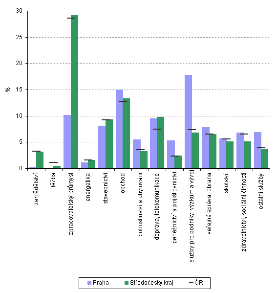 Během let 2000 až 2008 nedošlo k výrazné změně struktury zaměstnaných osob podle sektorů, ve kterých jsou zaměstnáni. Úbytek pracovníků v zemědělství se odrazil ve zvýšeném podílů pracovníků v sektoru služeb. V celé ČR pracuje v zemědělství okolo 3 % zaměstnaných osob, 41 % ve zpracovatelském průmyslu a 56 % ve službách. V Praze je tento poměr výrazně odlišný, sektor zemědělství v podstatě neexistuje, 4/5 zaměstnaných pracují v sektoru služeb, zbytek připadá na zpracovatelský průmysl. Struktura zaměstnaných ze Středočeského kraje je v podstatě stejná jako v případě celorepublikového rozdělení zaměstnaných podle sektorů.