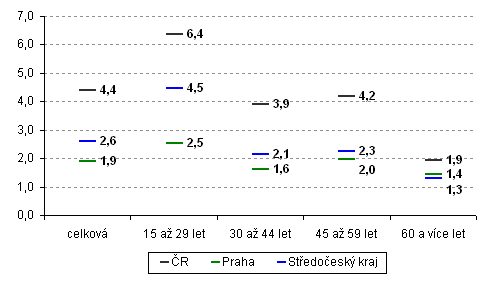 Data pocházejí z výběrového šetření pracovních sil, data za jednotlivá území jsou středy intervalů spolehlivosti, s klesající velikostí území roste tento interval. Obecný je trend snižování podílu nezaměstnaných osob ve věku 15-29 let v celkovém počtu nezaměstnaných. V hlavním městě je rovněž snížené zastoupení nezaměstnaných ve věkové skupině 30-44 let, naopak je zde větší podíl nezaměstnaných starších 60 let, což opět poukazuje na fakt, že osoby v Praze jsou ekonomicky aktivní i ve vyšším věku. Struktura nezaměstnaných podle věku ovšem vyplývá z věkové struktury celé populace.