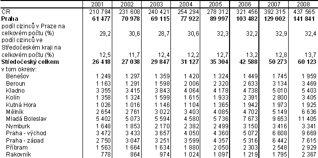 Na počtu ekonomicky aktivních osob se podílejí i cizinci žijící a pracující v ČR. Více informací o dostupnosti údajů o zaměstnanosti cizinců je v metodických vysvětlivkách. Počet zaměstnaných cizinců se udává jako součet počtu cizinců s živnostenským oprávnění, počtu cizinců s povolením k zaměstnání a cizinců, o kterých má úřad práce informaci o tom, že nastoupili výkon práce. Nelegální pracovní migrace pochopitelně není zahrnuta. Podle těchto zdrojů byl celkový počet zaměstnaných cizinců v Praze v roce 2008 cca 115 tisíc. Ve statistikách o celkových počtech jsou cizinci tříděni podle místa bydliště, v případě zaměstnání jsou tříděni podle místa výkonu práce. Pokud zanedbáme možnost, že místo (okres, kraj) bydliště se může lišit od místa výkonu práce, lze říci, že v Praze je v průměru let 2001 až 2008 cca 80 % cizinců zaměstnaných, ve Středočeském kraji je to o něco více, cca 83 %. Největší počet cizinců byl registrován v okrese Mladá Boleslav a Praha-východ, stejné územní rozložení existuje i u zaměstnaných cizinců. V Mladé Boleslavi je nahlášeno téměř 25 % zaměstnaných cizinců Středočeského kraje, v Praze-východ pak téměř 20 %. Z dat o pracujících cizincích je vidět, že se koncentrují zejména do okresů s velkými městy. Územní rozložení cizinců celkem bylo mnohem více rovnoměrné, než je územní rozložení zaměstnaných cizinců. Např. v okrese Praha-východ bylo registrováno 7 % celkového počtu cizinců Středočeského kraje, ale zaměstnaných cizinců zde bylo mnohem více – téměř 20 %.