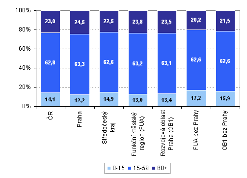 Zejména v souvislosti s významnou migrací dochází ke změně věkové struktury obyvatel ve sledovaných územích. V Praze došlo k mírnému zvýšení počtu obyvatel, posílena byla skupina seniorů, zastoupení osob ve věku 15-59 se v podstatě nezměnilo, ve struktuře podle věku oslabila skupina dětí ve věku 0-14 let.