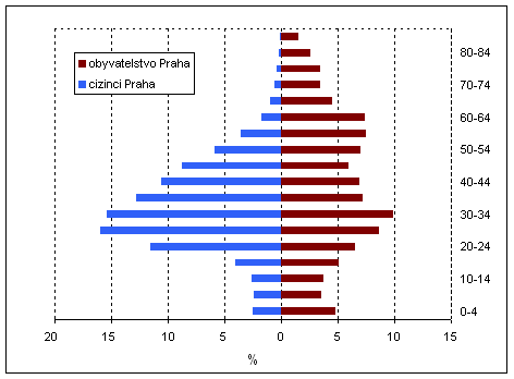 V populaci cizinců je výrazně větší zastoupení osob ve věku 20-29 let - téměř dvakrát větší, naopak zastoupení starších osob, cca od 50 let věku je velmi výrazně nižší. Také zastoupení dětské složky populace, které je přibližně dvakrát menší než v případě obyvatelstva Prahy vypovídá o ekonomické motivaci migrace převážné většiny cizinců. Motivace cizinců zůstat v ČR je rozdílná u různých státních občanství cizinců. Převážná většina cizinců s dlouhodobými pobyty (většinou se má za to, že cizinci s dlouhodobými pobyty nemají v úmyslu se v ČR usadit) má státní občanství Ukrajinské, naopak ruští státní příslušníci mají častěji trvalé pobyty.