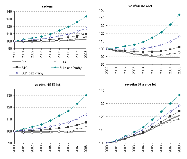 Ve Středočeském kraji se počet obyvatel v období 2000-2008 zvýšil vyšší měrou než v Praze. Zvýšení počtu osob se projevilo ve všech základních věkových skupinách, nejvýznamněji opět u osob důchodového věku. Migrace starších obyvatel není intenzivní, zvyšování počtu obyvatel tohoto věku ve sledovaném území je způsoben především stárnutím populace, která v území žije. Počet dětí ve Středočeském kraji byl v roce 2008 jen mírně vyšší než v roce 2000, jejich počet se zvyšoval od roku 2004.