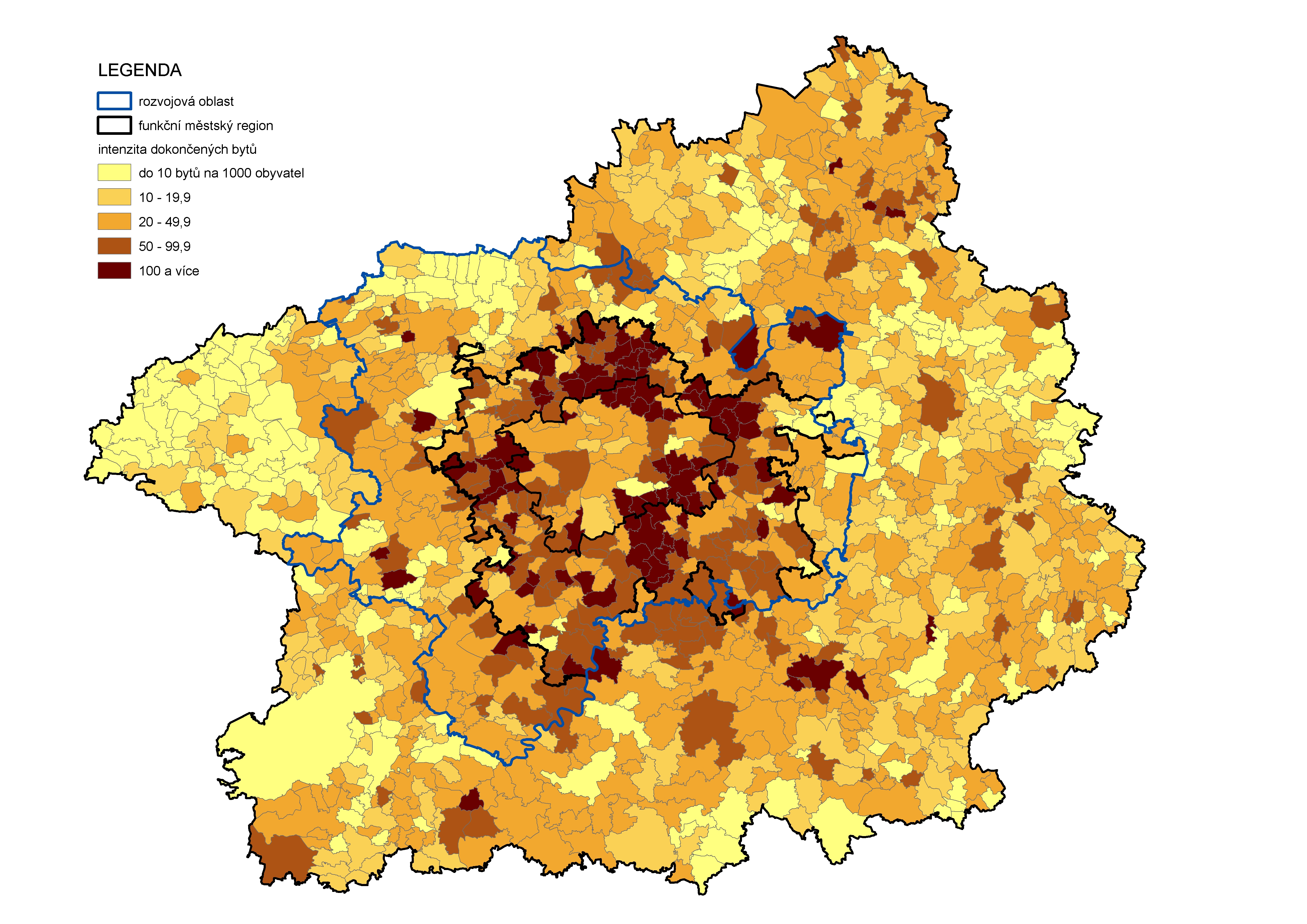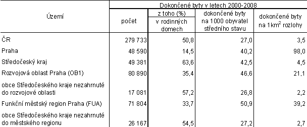 Rovněž souhrnná hodnota intenzity bytové výstavby (počet dokončených bytů v období 2000-2008 na 1 000 obyvatel středního stavu stejného období) ve Středočeském kraji převyšuje hodnotu pražskou. Ve Středočeském kraji byla intenzita výstavby v období 2000-2008 43 bytů. Nejvyšší intenzita dokončených bytů byla opět v ORP sousedících s územím Prahy - Černošice (126), Brandýs n/L – Stará Boleslav (108), Lysá n/L (89) a v ORP Říčany (75) Poměrový ukazatel měří počet dokončených bytů a obyvatel trvale bydlících v území. Obyvatelé, kteří nové byty obydlí se mohou k trvalému pobytu přihlásit s určitým časovým zpožděním.