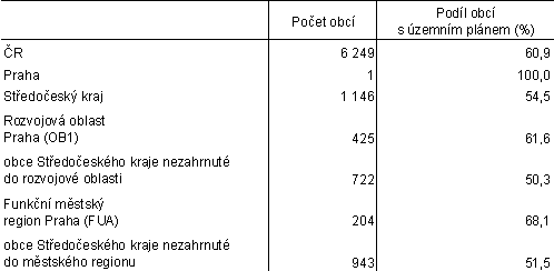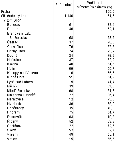 V celém Středočeském kraji je podíl obcí se zpracovaným územním plánem nižší než je tomu u všech obcí ČR. Ve správních obvodech kraje je podíl obcí systematicky plánujících budoucí využití svého území odlišný, pohybuje se od 87 % obcí v obvodu Černošic až po 19 % v obvodu Rakovník.