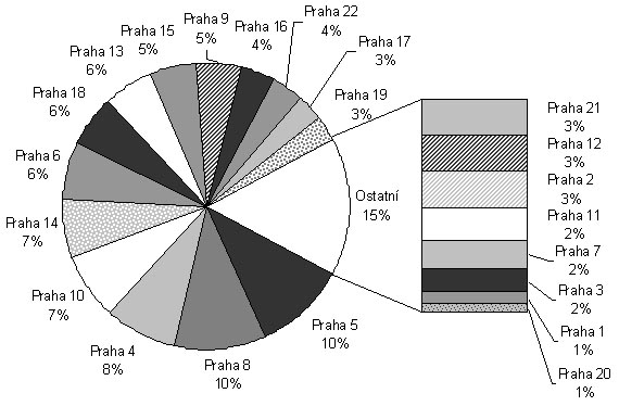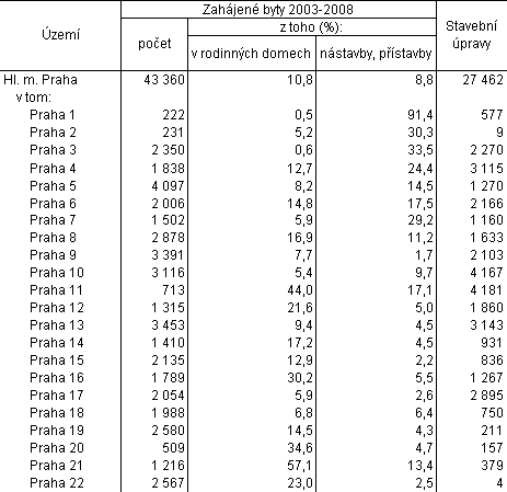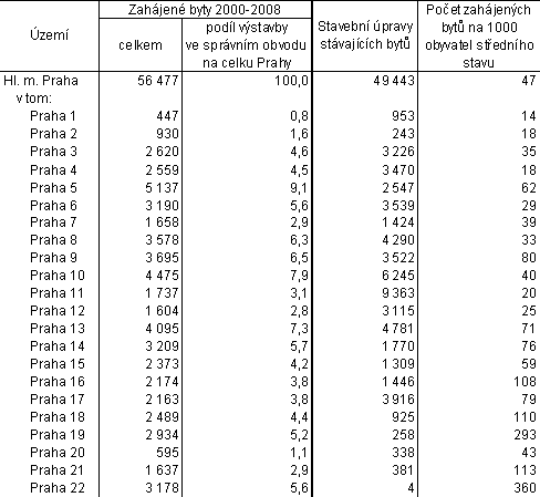 Nejvíce bylo v období 2000-2008 zahájeno bytů v pražských obvodech Praha 5 (9,1 %), Praha 10 (7,9 %) a Praha 13 (Jihozápadní město, 7,3 %) z celkového počtu zahájených bytů v Praze. V přepočtu na počet bydlících obyvatel byla zahájená stavební aktivita nejintenzivnější v obvodech Praha 22 (Uhříněves, Benice, Královice, Nedvězí a Kolovraty, 360 zahájených bytů na 1 000 obyvatel), Praha 19 (Kbely, Satalice a Vinoř, 293), Praha 21 (Újezd nad Lesy, Běchovice, Klánovice a Koloděje, 113), Praha 18 (Letňany a Čakovice, 110) a Praha 16 (Radotín, Lipence, Lochkov, Velká Chuchle a Zbraslav, 108).