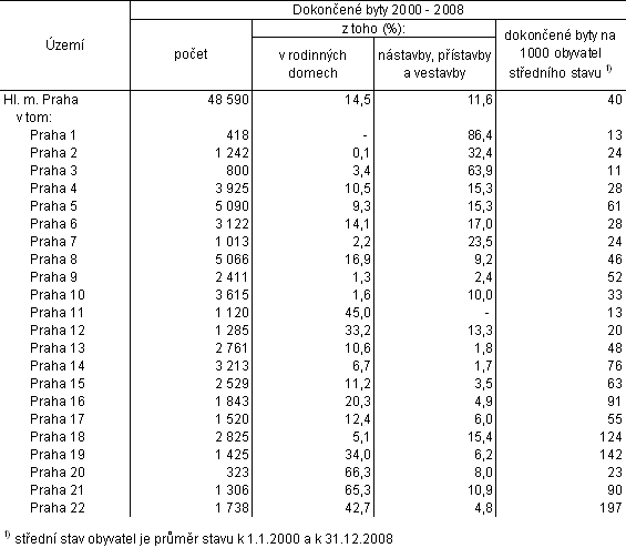 Celkem bylo v Praze od roku 2000 dokončeno 48 590 bytů. Správní obvody hlavního města, kde bylo postaveno nejvíce bytů v absolutních číslech jsou obvody Praha 5, Praha 8, Praha 4, Praha 10, Praha 14 a Praha 6. V těchto územích činila dokončená bytová výstavba v letech 2000 – 2008 více než 3 tis. bytů. S výjimkou Prahy 14 se jedná o územně rozsáhlé obvody, které zasahují zároveň do centrální části města i směrem k hranicím města, kde stále existuje potenciál pro novou výstavbu.