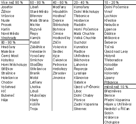 Na opačném konci žebříčku podle počtu dokončených bytů se nacházejí Praha 20 (Horní Počernice) a centrální správní obvody Praha 1 a 3 (vnitřní části města s omezenou možností nové výstavby), kde počet dokončených bytů ve zmíněném devítiletém období činil méně než 1 000 bytů.