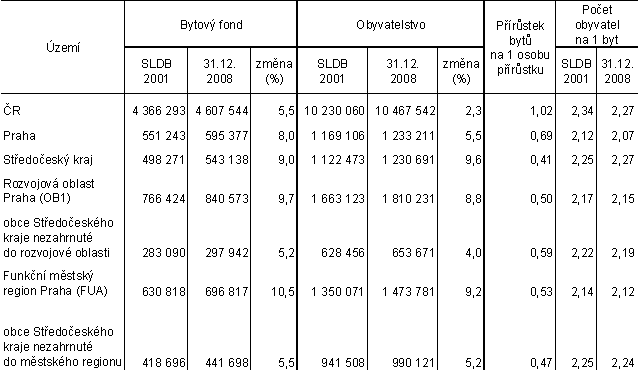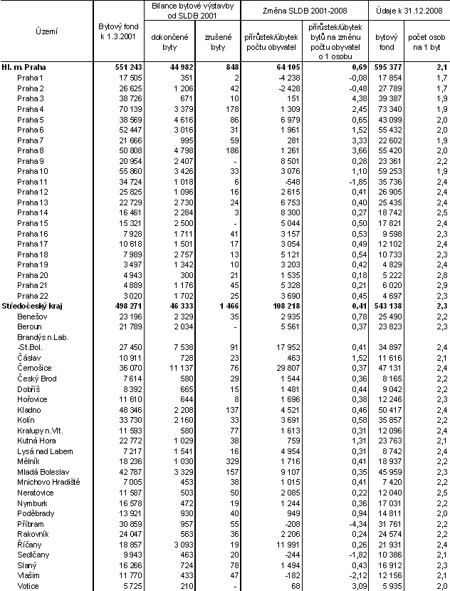 Ve Středočeském kraji došlo k mírnému zvýšení průměrného počtu osob na 1 byt. Nová výstavba zajišťuje potřebu bydlení pro nové obyvatele v území. V jednotlivých menších územích kraje je vývoj mezi počtem obyvatel a bytového fondu podobně rozdílný jako mezi jednotlivými částmi Prahy. Počet obyvatel od SLDB 2001 poklesl ve Středočeském kraji v obvodech Příbram, Sedlčany a Vlašim, přesto i zde došlo k rozšíření bytového fondu. Větší přírůstek bytů, než činil nárůst počtu obyvatel, byl v obvodech Čáslav, Kutná Hora a Votice. V ostatních obvodech bylo zvýšení počtu bytů menší než přírůstek obyvatelstva, a to v různém poměru.