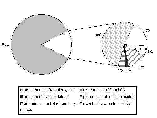 Hlavní město soustřeďuje pracovní příležitosti, což má dopad na zvýšený zájem o bydlení přímo ve městě i v jeho okolí, které je dopravně dobře obslouženo. Výstavba bytů je intenzivní a rušení bytů minimální. Čím těsnější je okolí města, tím menší intenzitu zrušených bytů pozorujeme. V Praze bylo v období 2000-2008 zrušeno 0,8 bytu na 1 000 obyvatel středního stavu. Hodnota ukazatele je vyšší ve Středočeském kraji a vyšší celkem za republiku. Mezi důvody zrušení bytu je i možnost sloučení s jinou bytovou jednotkou. Skutečný počet zrušených bytů je pravděpodobně nižší než udávaná čísla. Případy zrušených bytů, které se staly součástí jiné bytové jednotky, tvořily v ČR v roce 2008 pouze 3%. Následující graf ukazuje rozdělení zrušených bytů podle důvodu v tomto vybraném roce.