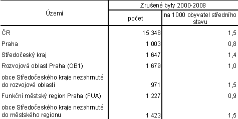 Zrušené byty dosahovaly pouhého zlomku (2% v Praze, 3 % ve Středočeském kraji) počtu bytů dokončených, což vypovídá o potřebnosti stávajícího bytového fondu. Zrušení bytové jednotky podléhá rovněž hlášení. To však nutně neznamená, že bytové jednotky v současné době neobývané nebo dokonce neobývatelné jsou v tomto počtu zahrnuty. Po povodních v roce 2002 byl zaregistrován zvýšený počet zrušených bytů v území sousedícím s tokem Vltavy. Je diskutabilní, nakolik zvýšení tohoto počtu odpovídá skutečnému dopadu záplav na možnosti bydlení v zasažených oblastech. Počty zrušených bytů z obdržených hlášení jsou jediným údajem, který je možné použít pro hodnocení úbytku bytového fondu. O bytech v současné chvíli neobývaných pro špatný technický stav je možné nadále uvažovat jako o potenciální možnosti bydlení a nadále tak tvoří součást bytového fondu. Připravované sčítání lidu v roce 2011 nám přinese aktuální informace o stavu bytového stavu na území celé republiky.